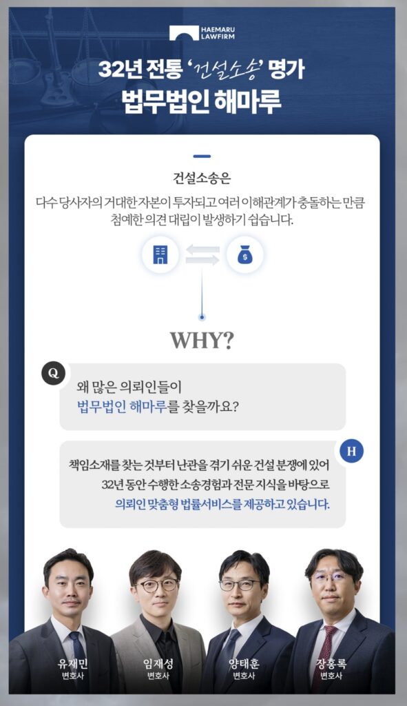 법무법인 해마루는 건설 분쟁 및 행정처분 대응 경험을 바탕으로 사전 예방부터 처분 대응, 소송까지 전 과정을 체계적으로 지원하고 있습니다.