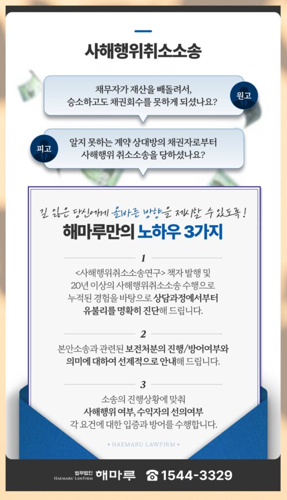 사해행위취소소송은 ‘수익자의 악의’를 추정하는 구조라 방어 전략을 제대로 세워야 억울한 피해를 막을 수 있어요.